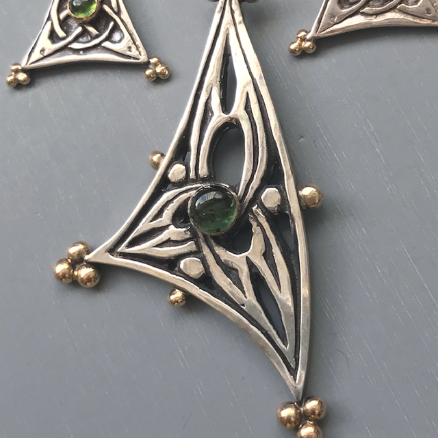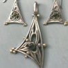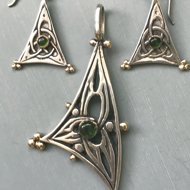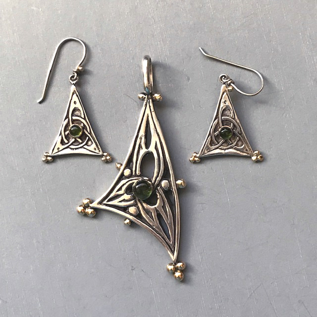 Description MICHAEL HAYMAN Celtic inspired pendant and earrings, all in sterling silver with 14 karat gold accents. The green stones are more prominent in person, and the green color shows much better.