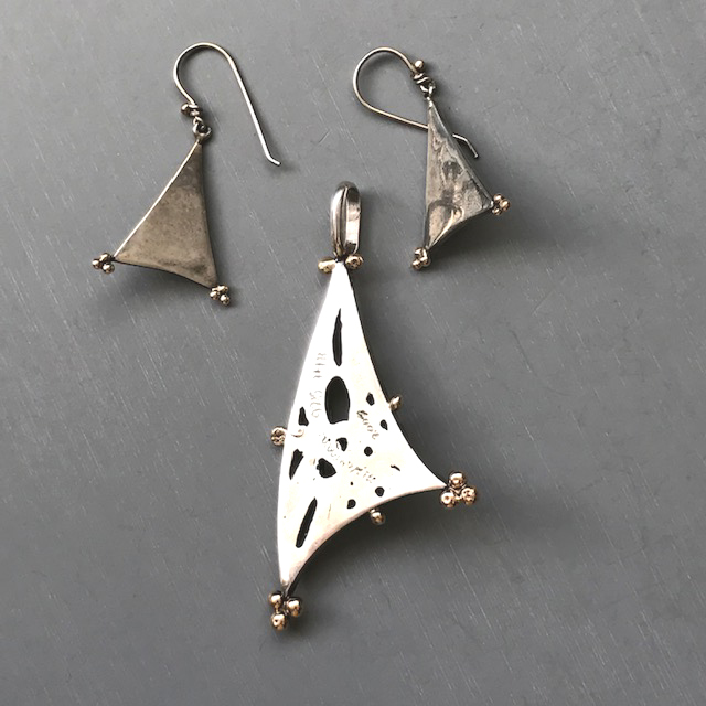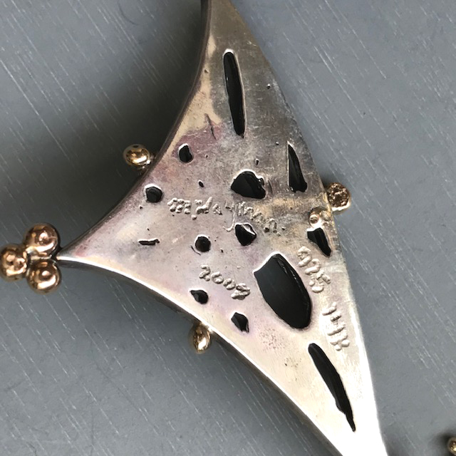 The pendant is signed on the back "M Hayman, 925 14k" and the year 2007. One earring is marked "MH, 14k sterling" and the other matching earring is not signed.