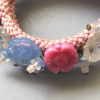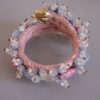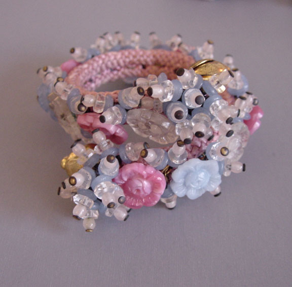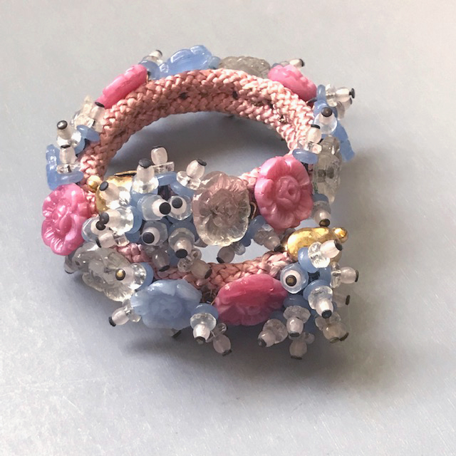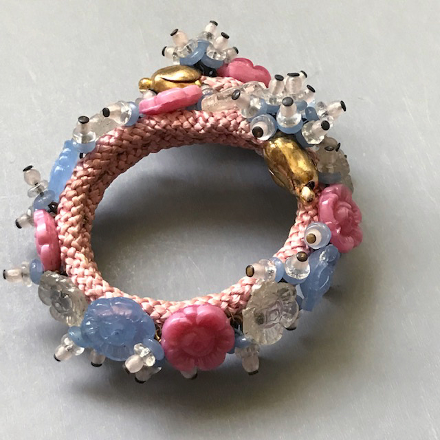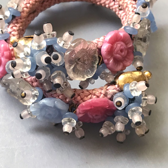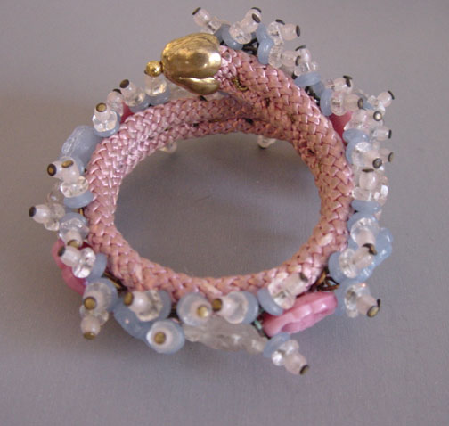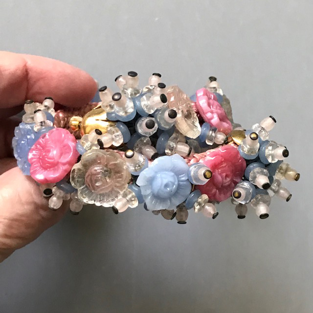 MIRIAM HASKELL by Frank Hess coil bracelet of pink, blue and clear glass beads and flowersThis intricate bracelet is made up of pate de verre glass, glass beads and flowers and seed beads, just lush and gorgeous and all made by hand. The base is a woven cloth-covered heavy wire coil so it wraps around the wrist and clings to it. It's 7" long and about 1" wide and in excellent vintage condition. It is a Frank Hess design for Miriam Haskell jewelry made by hand in about 1940, and as was typical of that era, it is not signed. Unlike far too much of supposedly Haskell jewelry on line these days, this is a genuine Miriam Haskell and has not been altered since the day it was originally made. View View View View View Product #34291 All items in excellent vintage condition unless otherwise noted.