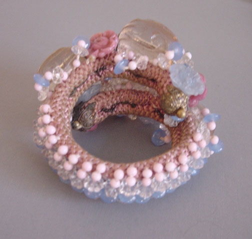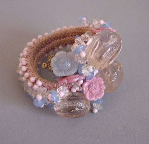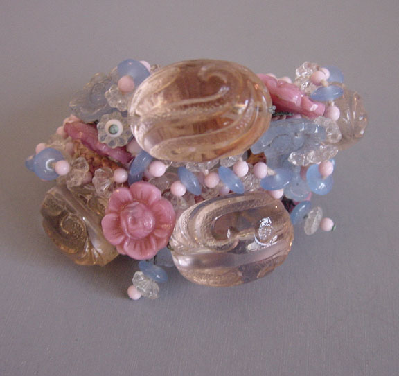 Description MIRIAM HASKELL by Frank Hess coil bracelet of pink tinted pate de verre and pink, blue and clear glass beads and flowers, hand made in the 1930s.