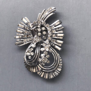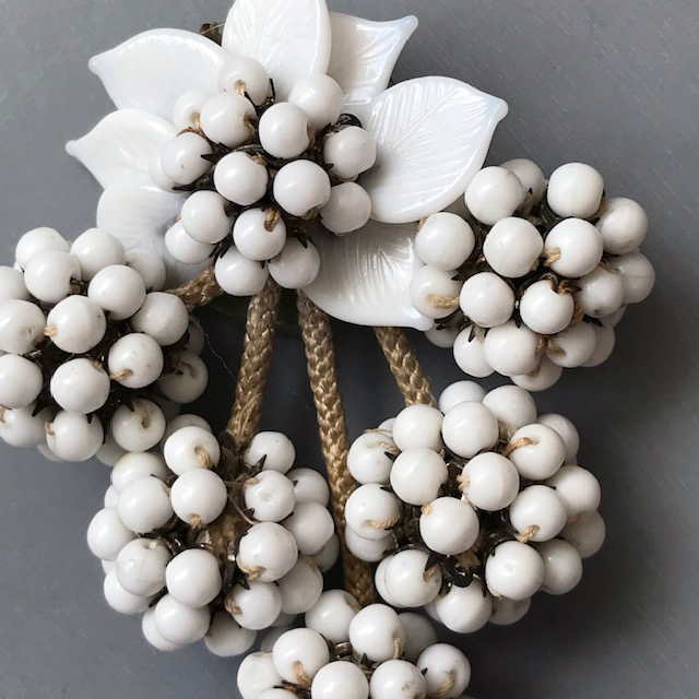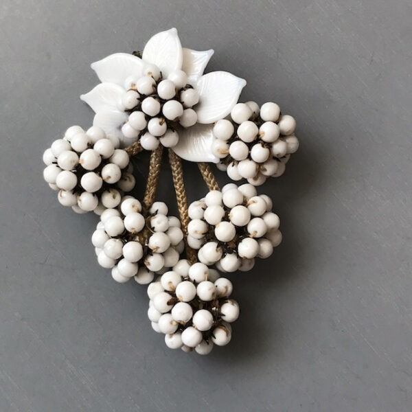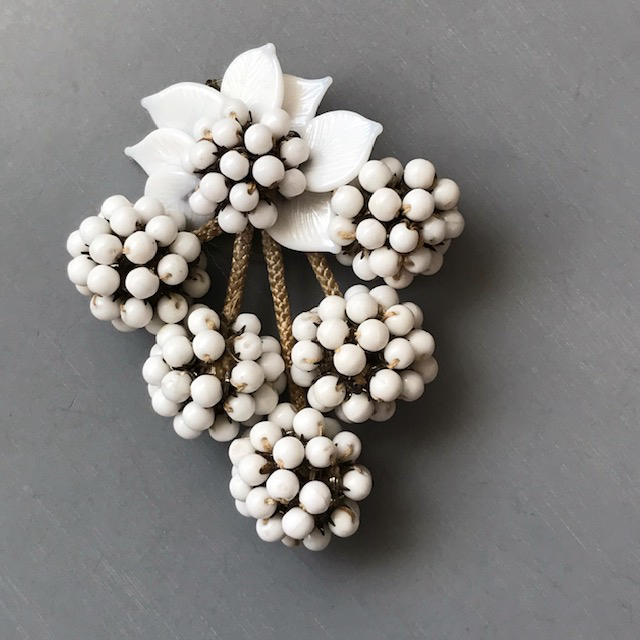 MIRIAM HASKELL milk white glass dress clip with beaded balls suspended by woven lines from lovely white pressed glass leavesProduct #42107 All items in excellent vintage condition unless otherwise noted.