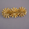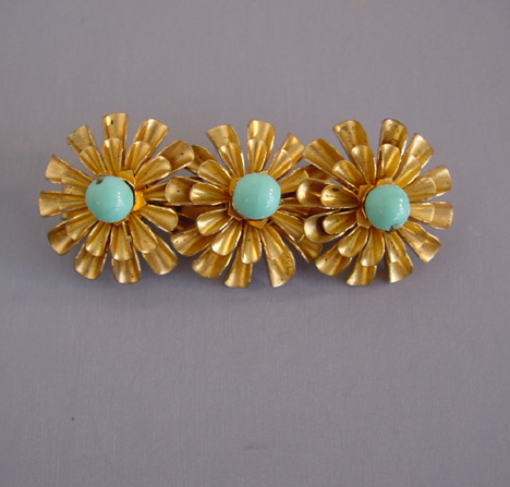 DescriptionMIRIAM HASKELL by Frank Hess three flowers bar brooch with aqua glass bead centers and lots of lovely gold plated petals, 3" by 1-1/4".