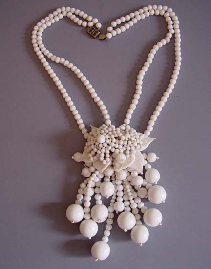 MIRIAM HASKELL white glass leaves and beads necklace with a lovely wedding bouquet lookProduct #H29971 All items in excellent vintage condition unless otherwise noted.