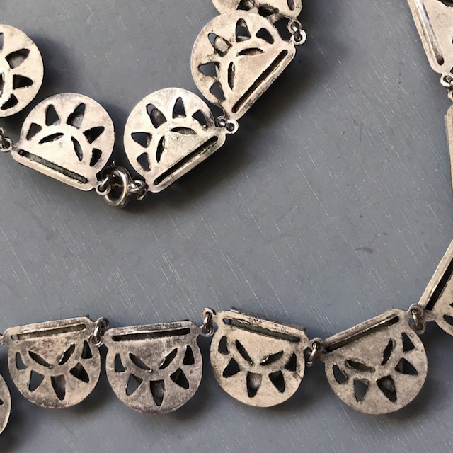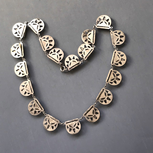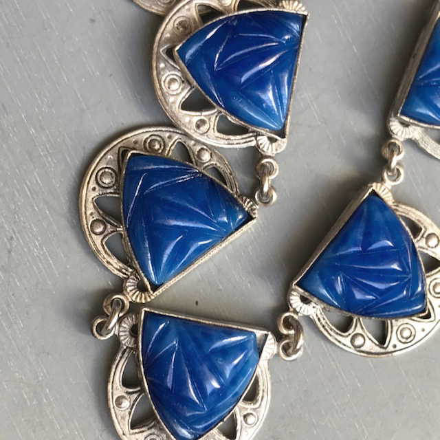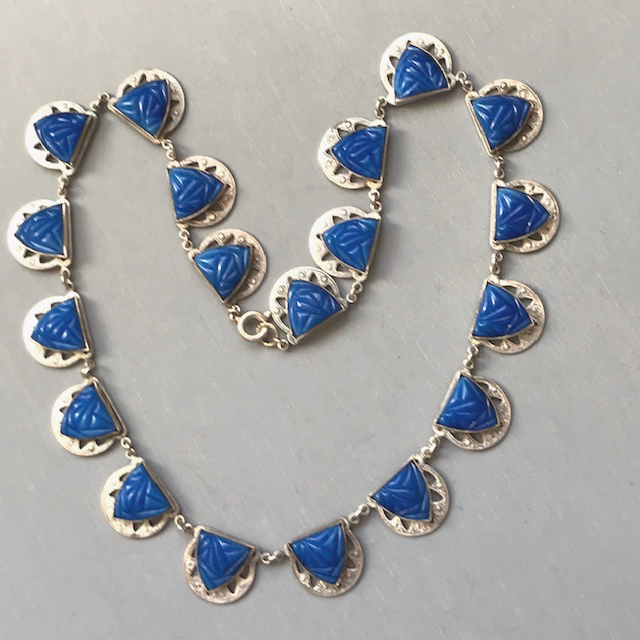 MODERNIST or Czech Deco necklace with blue segments with an interesting geometric pressed designProduct #42127 All items in excellent vintage condition unless otherwise noted.
