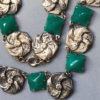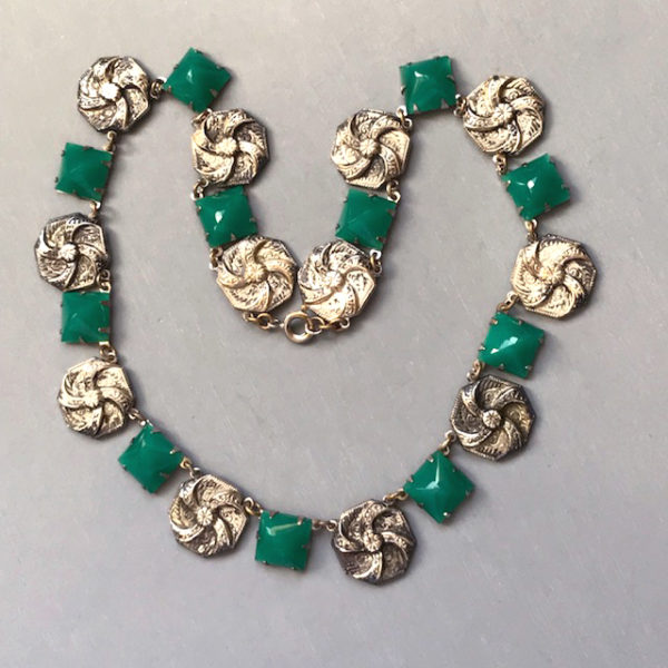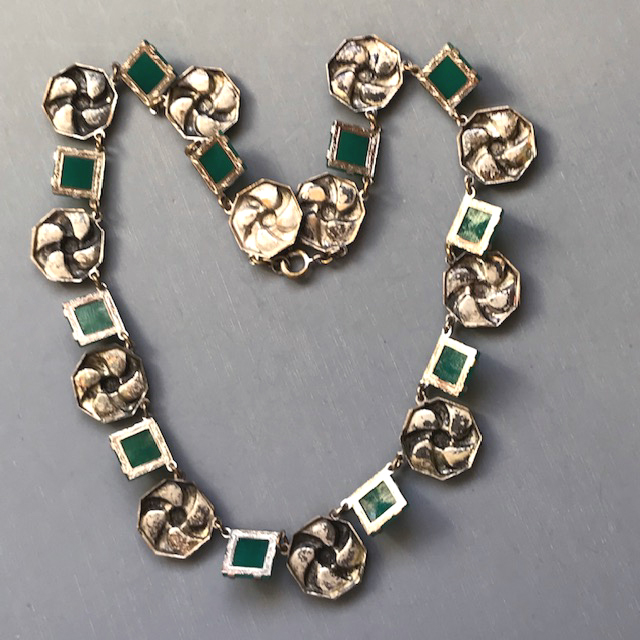 MODERNIST or Czech Deco necklace with green squares alternating with silver tone swirling circle elementsIt is 16" wearable length and about 3/4" wide disks, and the settings are silver colored base metal. It is from the 1930s. View View View Product #42126 All items in excellent vintage condition unless otherwise noted.