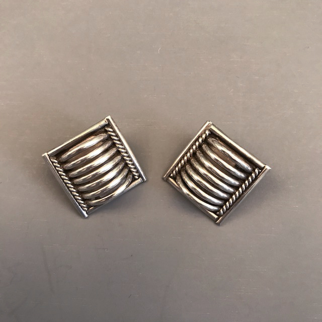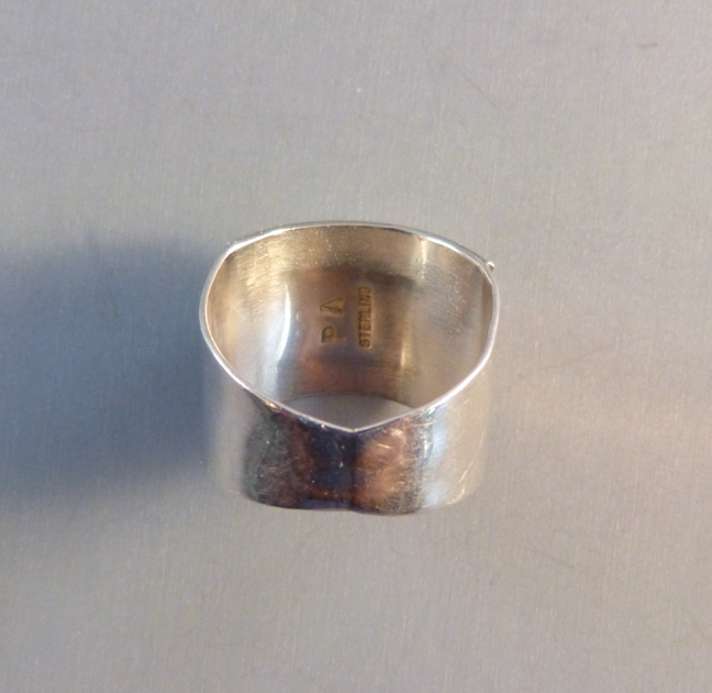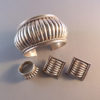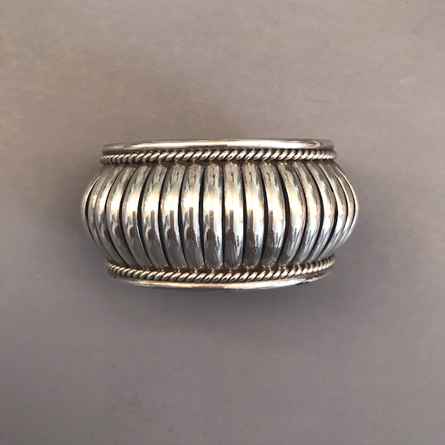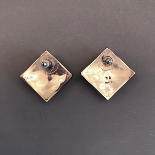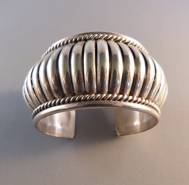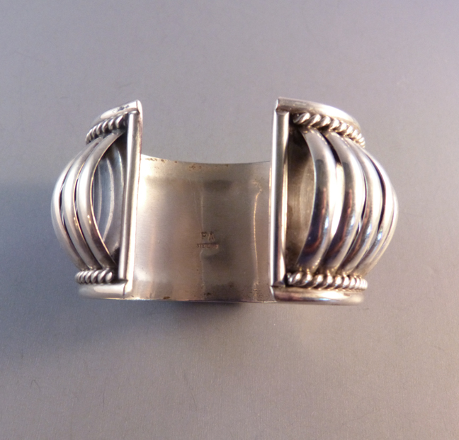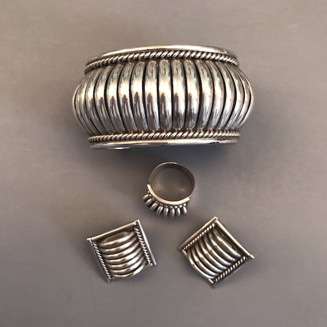 PRICILLA APACHE Native American Navajo set of a sterling silver ribbed melon cuff bracelet, ring and earringsThe "PA" mark is for Priscilla Apache, niece of Navajo jeweler Tom Charley, and we understand that both she and Colton Charley had permission to make these designs. View View View View View View View View View View View Product #39903 All items in excellent vintage condition unless otherwise noted.