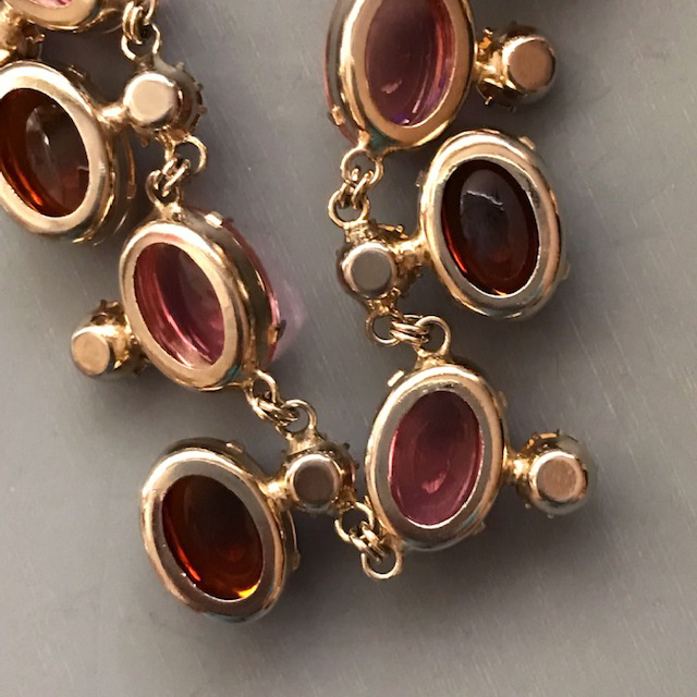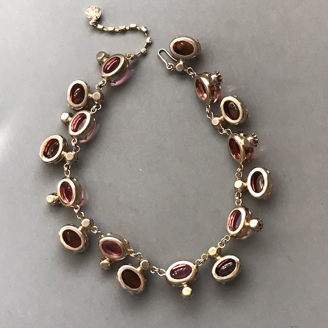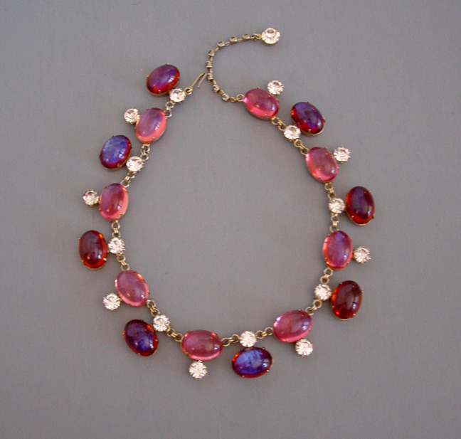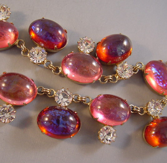 Description NECKLACE dragon's breath glass cabochons necklace with clear rhinestone accents, all prong set, the larger rhinestones are brilliant but the little ones at the back of the necklace are graying, although they will not been seen when this is worn. "Dragon's breath" is glass cabochon that is specially treated to give it this particular coloring and rainbow effect, which is a big favorite of mine. The findings are all gold plated metal and the necklace is a 14-15" wearable size about 1-7/8" wide. I have had necklaces before that were made like this one and one was signed "Austria" and "Vogue" (on a matching set of earrings) and another was marked "Vendome", but this necklace has no marks at all. HERE is a photo of the Vogue necklace and earrings. View View View View Product #37575