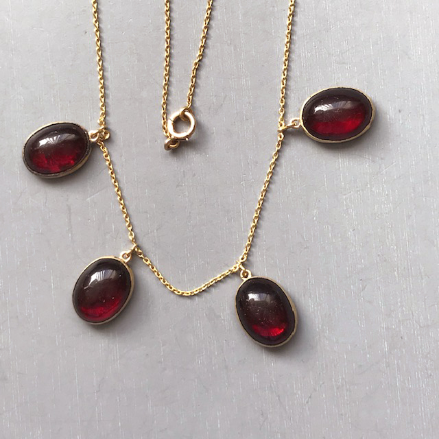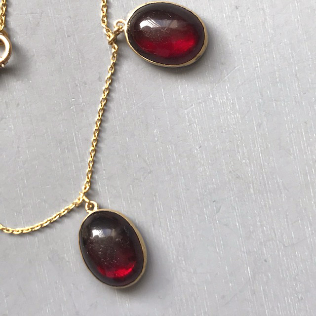 NECKLACE of lovely garnet colored oval glass cabochons in a gold filled setting and on an 18k yellow gold chain