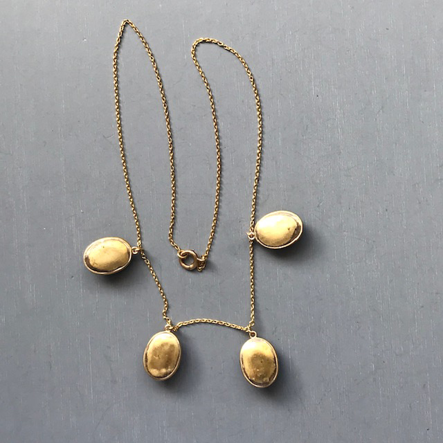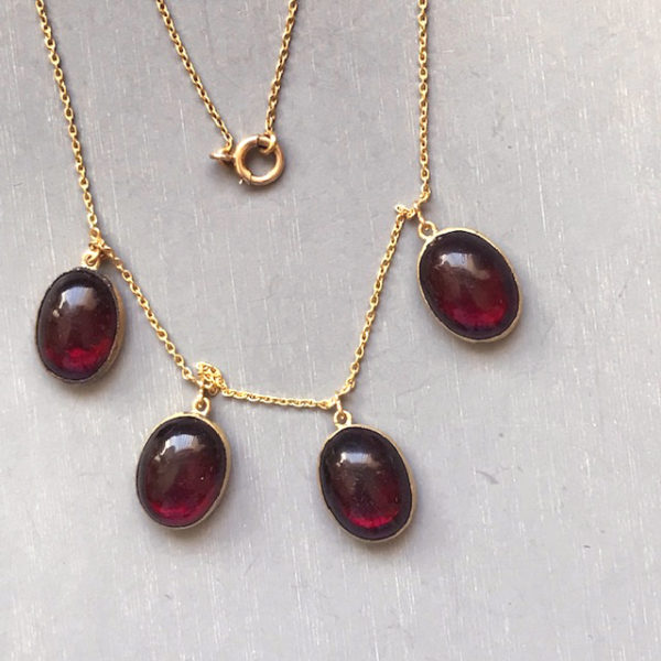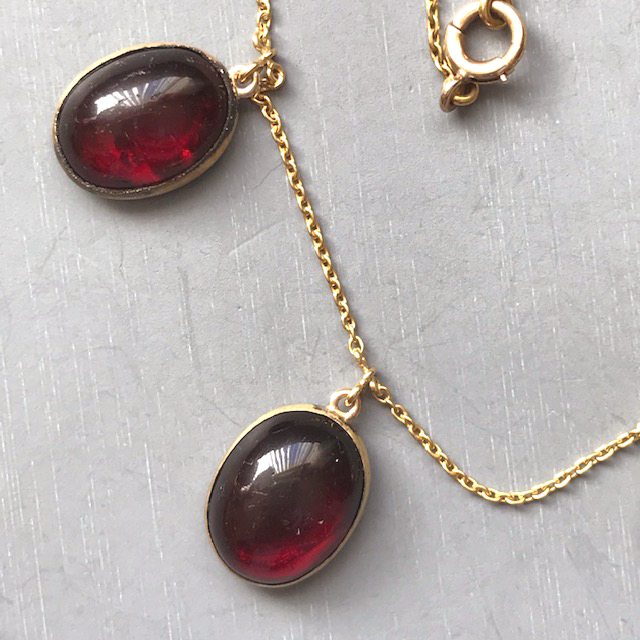 Description NECKLACE of lovely garnet colored oval glass cabochons in a gold filled setting and on an 18k yellow gold chain, 15" long.  The cabochons are a glowing rich color, as you can see in the photo, and each oval cabochon is 5/8" by 1/2".  Simple and oh so beautiful!   View  View  View  View