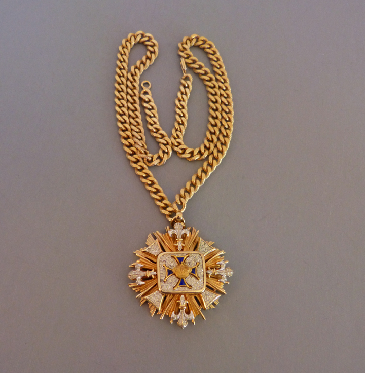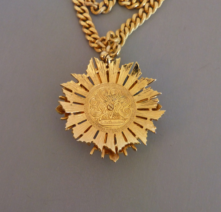 NETTIE ROSENSTEIN regal Maltese cross pendant with blue enamel and clear rhinestonesThis is the very same very high quality piece seen in Christie Romero's book "Warman's Jewelry", 3rd Ed, page 205. Nettie Rosenstein made clothing, accessories and jewelry from about 1935 to 1975. View View Product #9954 All items in excellent vintage condition unless otherwise noted.