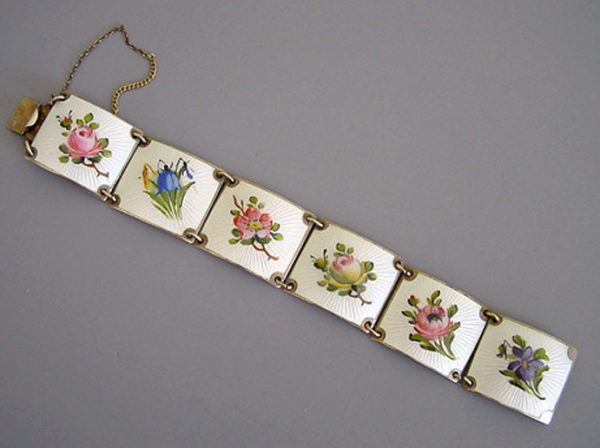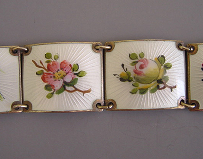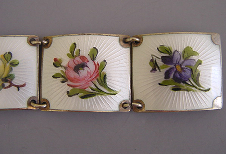 DescriptionNORWAY sterling enameled flowers bracelet, marked for Finn Jensen circa 1950, 6-1/2" by 7/8", total weight 1.4 ounces.