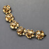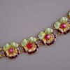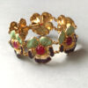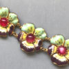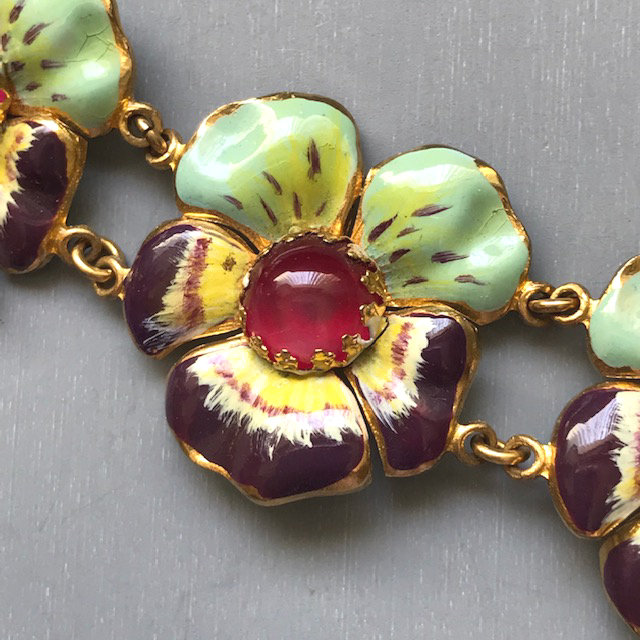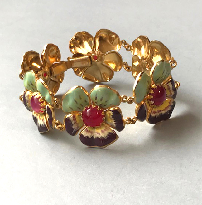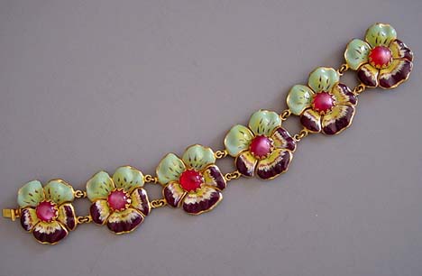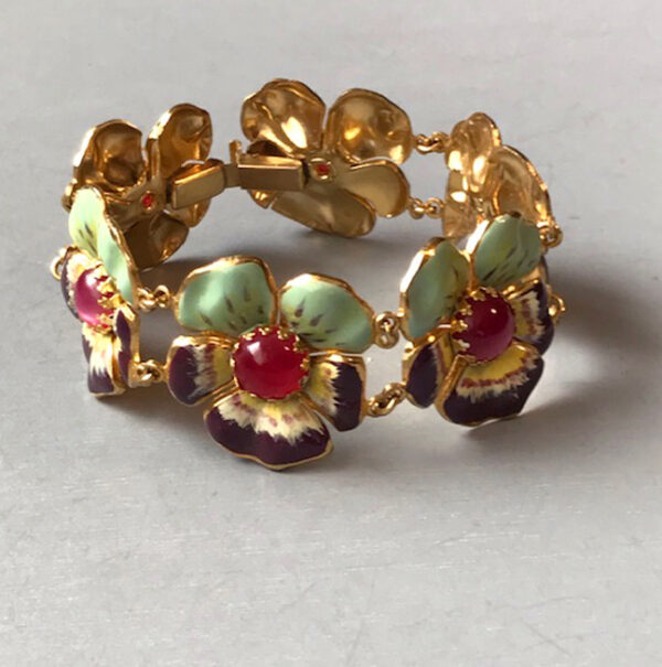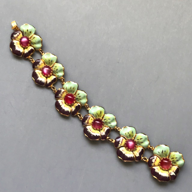 PANSY rare enameled pansy flowers bracelet with rose colored glass cabochon centers and purple, green and yellow enameled flowers