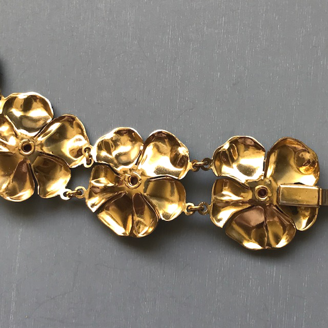 Description PANSY rare enameled pansy flowers bracelet with rose colored glass cabochon centers and purple, green and yellow enameled flowers on gold plated metal. This bracelet has really wonderful detail so be sure to look at the close-up photos. It is 7" by 1" and in excellent condition, amazing for it's age. I think it was made in the 1950s and with quality like this, I am surprised that it is not signed. It has been in my personal collection for over 30 years, and very well cared for. View View View ViewView View View View Product #Y19269
