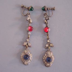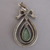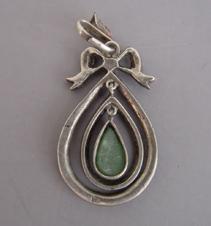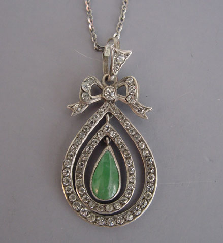 PASTE lavaliere pendant necklace with clear pastes and green center cabochon in a bow top teardrop-shaped silver setting. The three layers with which it is made allow for movement when it is worn.