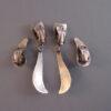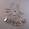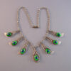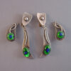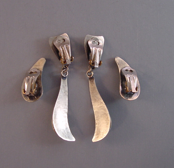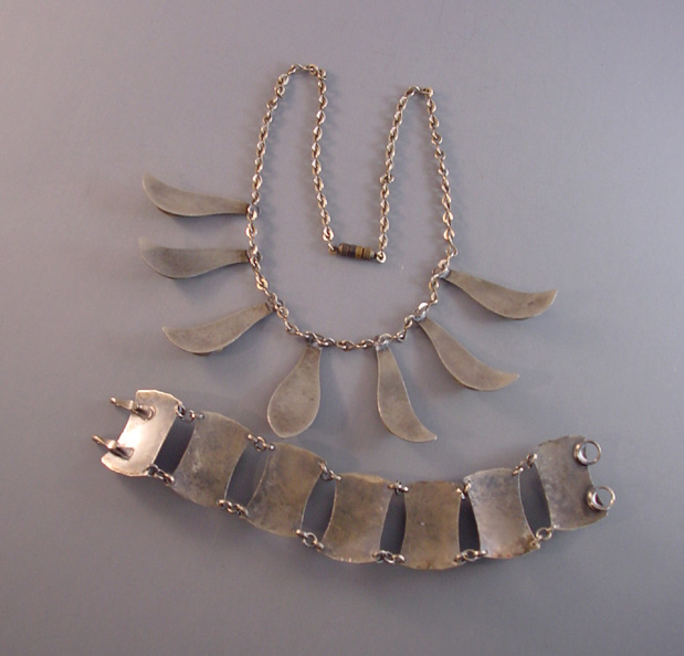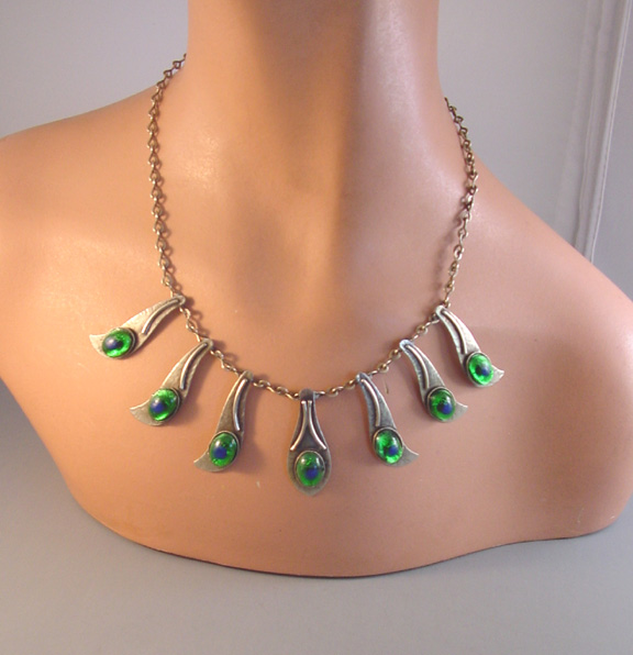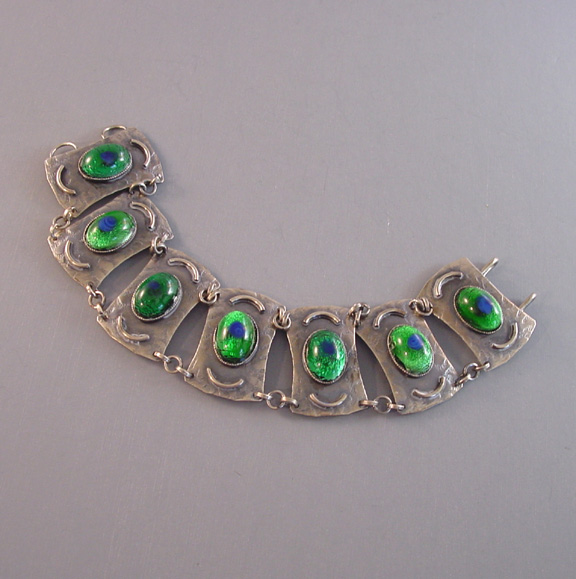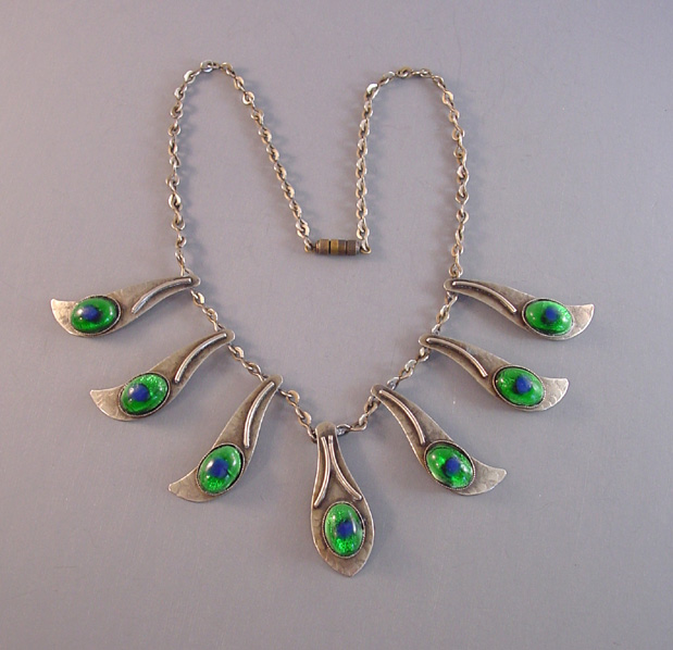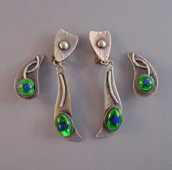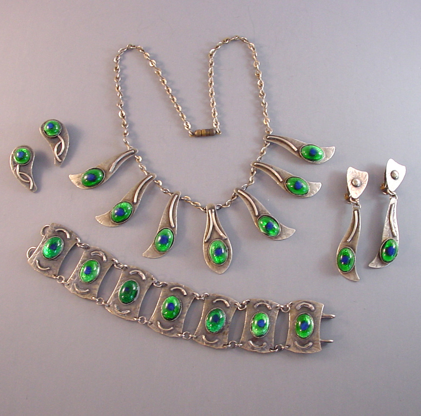 PEACOCK EYE Arts & Crafts parure set in textured silver with colorful glass peacock eye cabochons and earrings with clip backsPeacock eyes are made of crystal or glass over a silver foil, and according to Ginger Moro, some were made in Gablonz, Bohemia (Germany). The necklace is 17-1/2" and each leaf is 1-3/4"; the bracelet is 7" by 1"; the smaller earrings are 1" long, and the dangling clip back earrings are 2-5/8" from top to bottom. It has the older tube style closure on the necklace and it is all in excellent condition except for one small chip in the side of a stone on the smaller earrings, visible only under close examination. This is from the Amsterdam School of design, or Dutch Art Deco. A very kind lady from Holland let me know that this is from the 1950s. View View View View View View View Product #38623 All items in excellent vintage condition unless otherwise noted.
