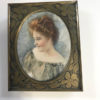 Description PORTRAIT hand painted portrait of a beautiful auburn-haired lady, masterfully done and framed in brass that has etched flower and leaf designs on it, 4" by 3-1/4". This is a portrait of a real person, and I would love to know who she was. The painting on this is fragile, and there are two places where it has rubbed off a bit, at 4 o'clock and 7 o'clock, as seen in the close-ups. It now has a clear cover on it to protect it.
