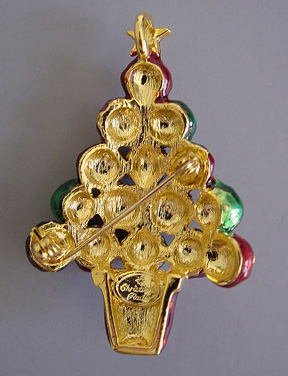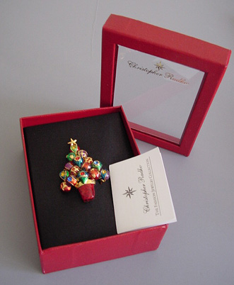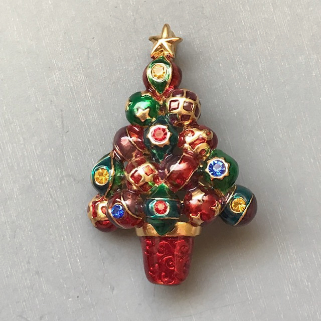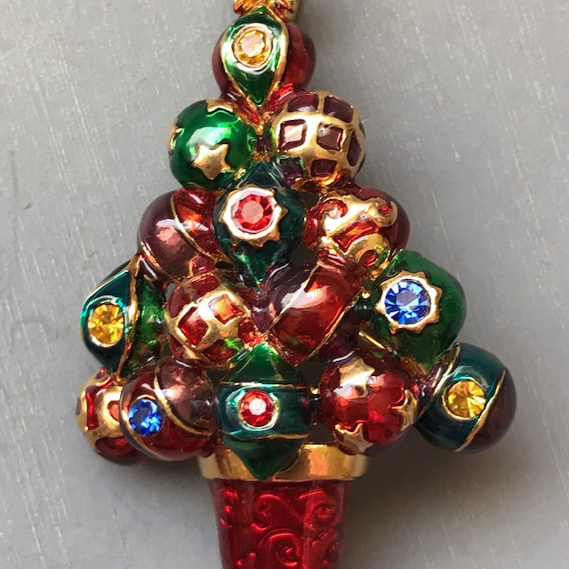 Description RADKO Christmas tree brooch with colorfully detailed enameled ornaments in gem tone colors, each slightly different, with colorful rhinestones too.  It is a gold tone metal setting and signed "Christopher Radko" on the back, it is 1-5/8" tall and in excellent condition, probably from the 1980s.  It comes with it's original red box.  View View