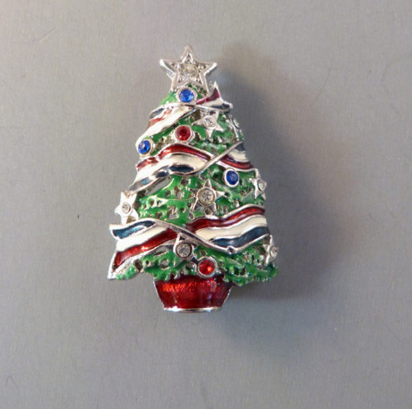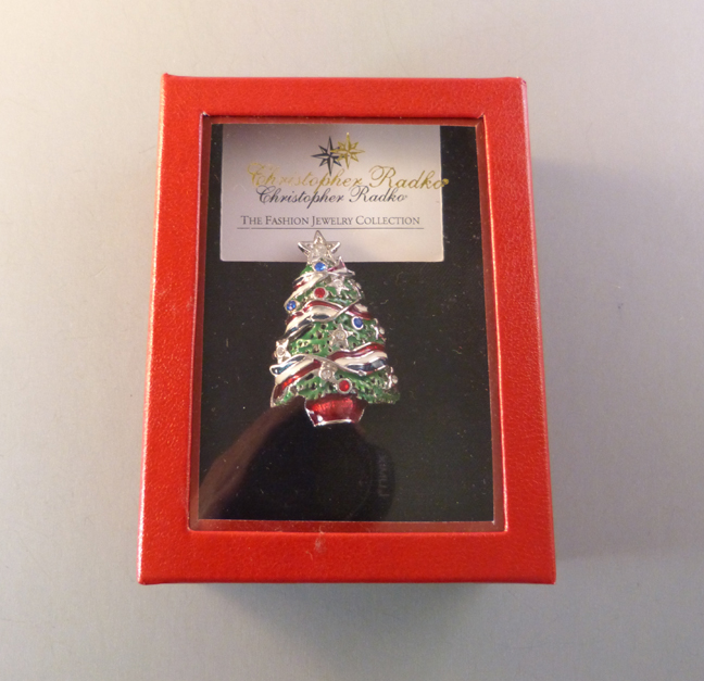 RADKO Christopher Radko Christmas tree brooch with original boxThe boughs are green enamel and the garlands are red and white enamel. The ornaments are red, clear and blue rhinestones, and it is set in silver tone, Signed on the back, it is 1-7/8" by 1-1/4". View View Product #66594 All items in excellent vintage condition unless otherwise noted.