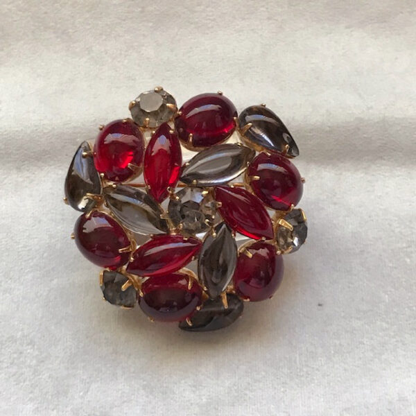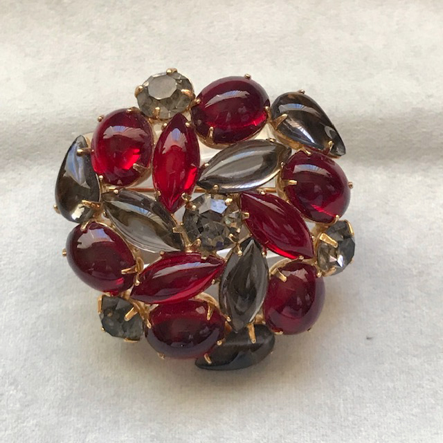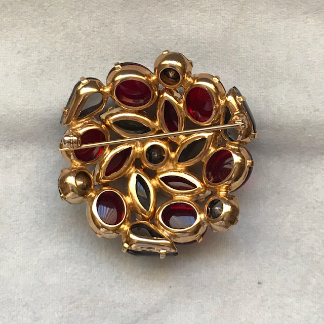 RED and TAN brooch glowing with unfoiled cabochon rhinestonesProduct #42690 All items in excellent vintage condition unless otherwise noted.