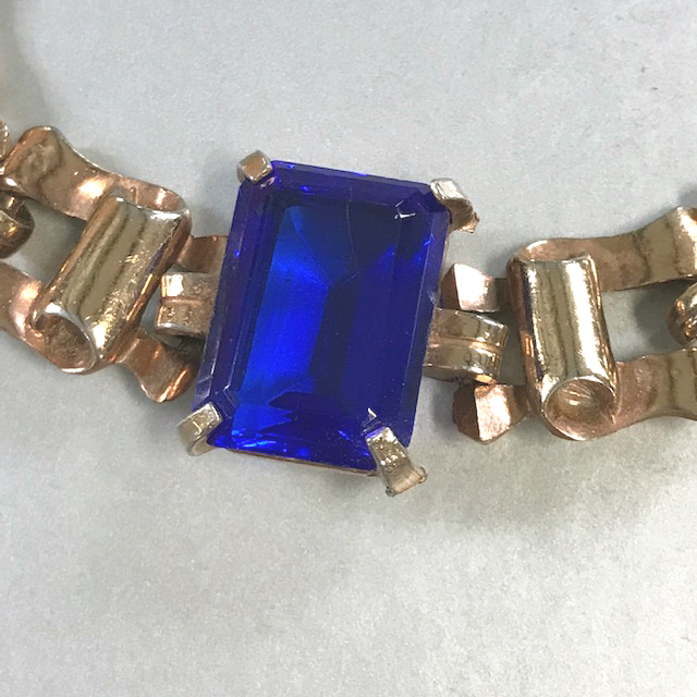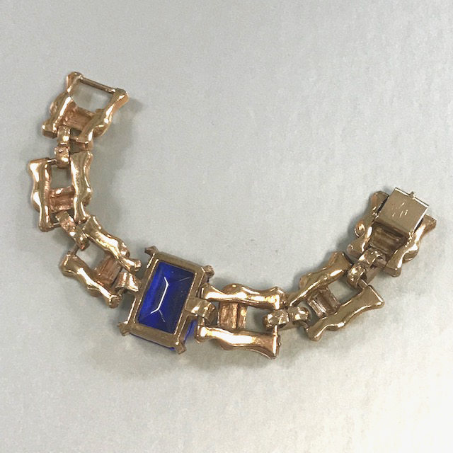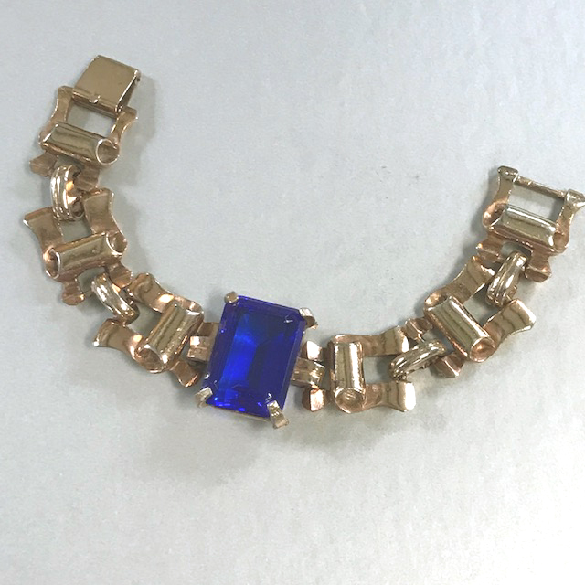 DescriptionRETRO style bracelet with a brilliant blue rhinestone center set in gold tone metal, 7" long and 1" at the most wide, circa 1950s. ViewView Product #41657