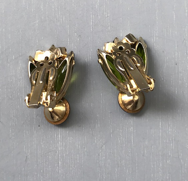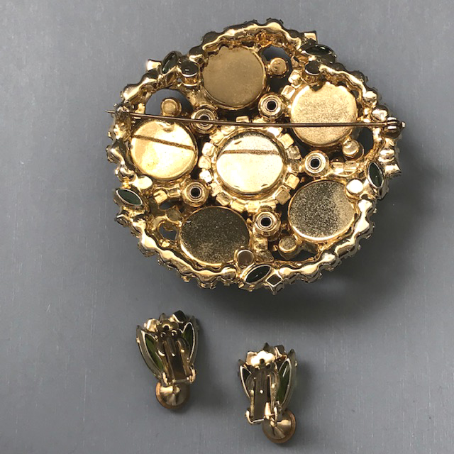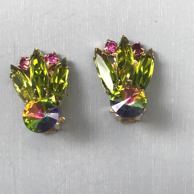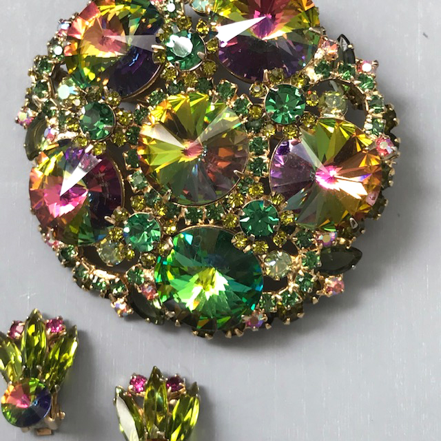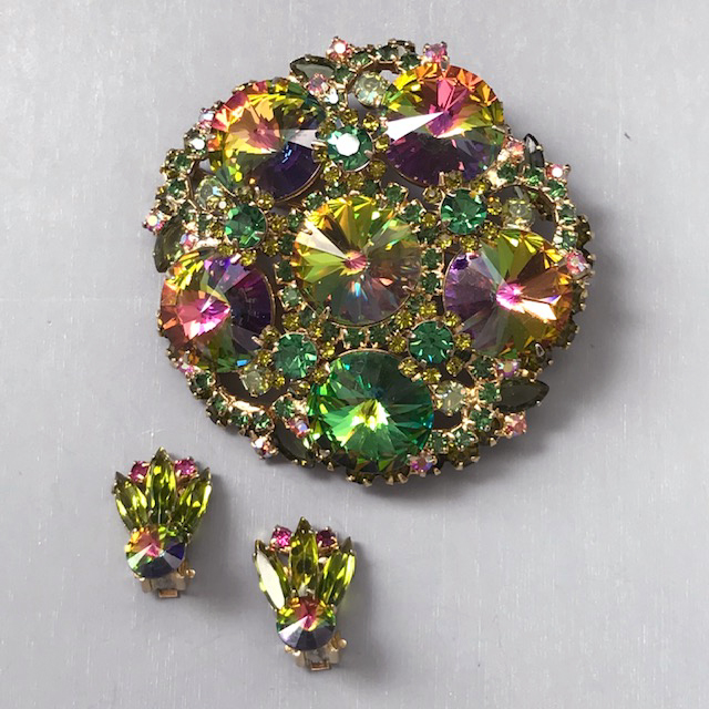 JULIANA D&E dazzling rivoli brooch and matching earrings with spectacular and very colorful green and rose colored rivoliThis is so lovely as the light catches it and such a rainbow of colors. View View View View Product #51000 All items in excellent vintage condition unless otherwise noted.