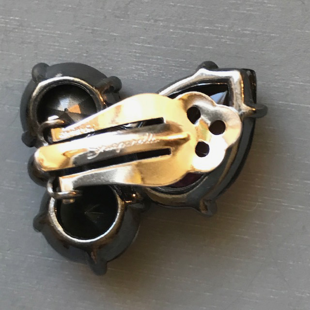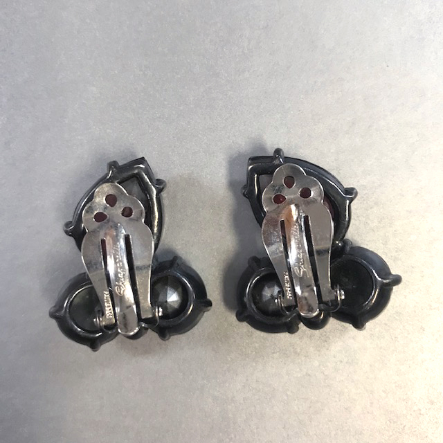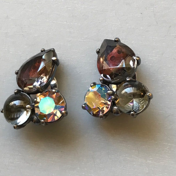 SCHIAPARELLI earrings with lovely gray glass cabochons, brown teardrop rhinestones shot through with rose color and aurora borealisView View Product #41699 All items in excellent vintage condition unless otherwise noted.
