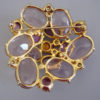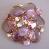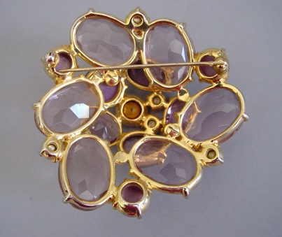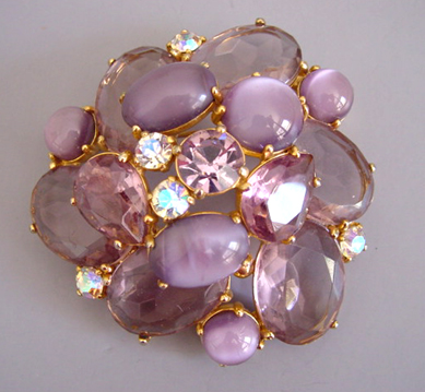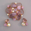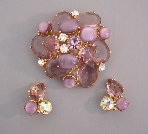 DescriptionSCHIAPARELLI lavender foiled and unfoiled rhinestones and cabochons brooch and earrings, all set in gold tone metal. The earrings are signed on the back but the matching brooch is not, which is typical of Schiaparelli brooches in this style. The brooch is 2-3/4" across, and the clip back earrings 1-1/4". This set is from the late 1950s. View Product #26293