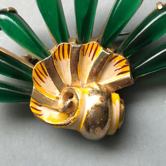 SEASHELL brooch, a yellow and cream enameled seashell in gold metal with elongated green glass raysProduct #42727 All items in excellent vintage condition unless otherwise noted.