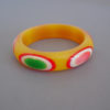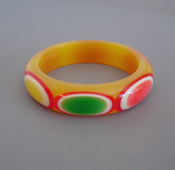 DescriptionSHULTZ bakelite yellow bangle with oval bull's eye dots in red, white, orange, green yellow and pink, 2-1/2" by 3/4" by 1/2". The Shultzs' started making bakelite jewelry in the 1980s and they make some pieces still.