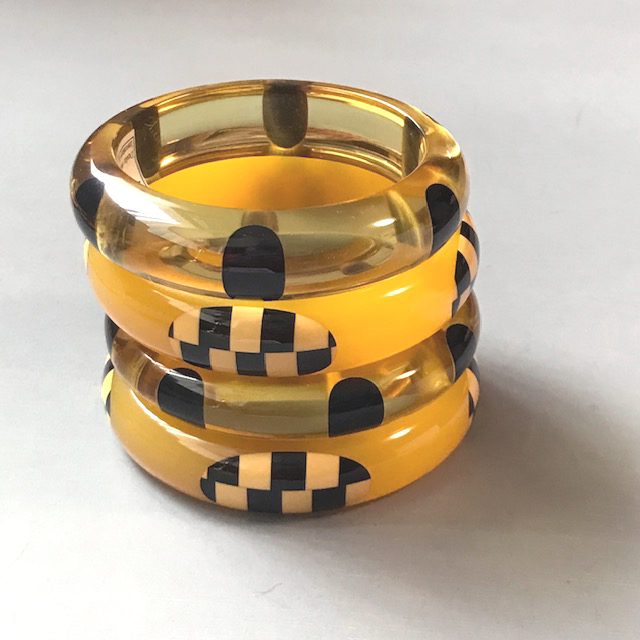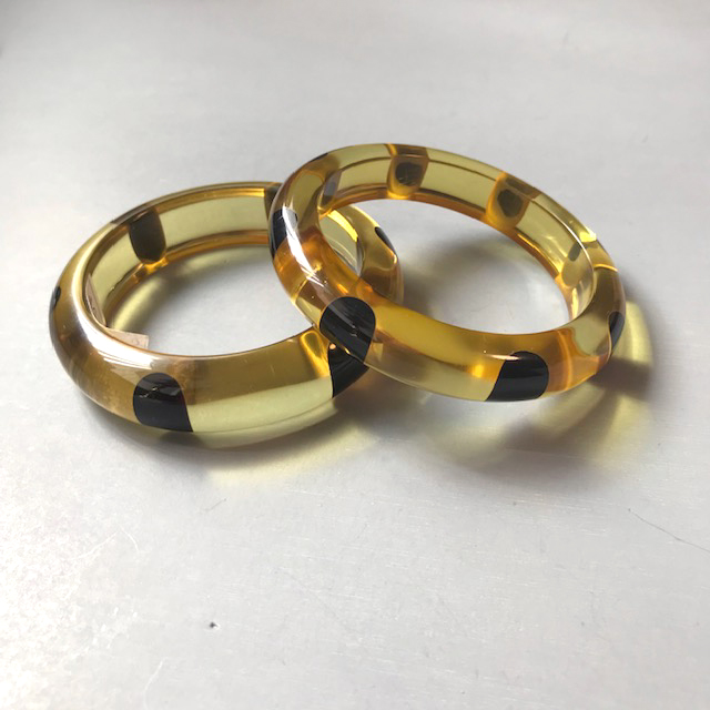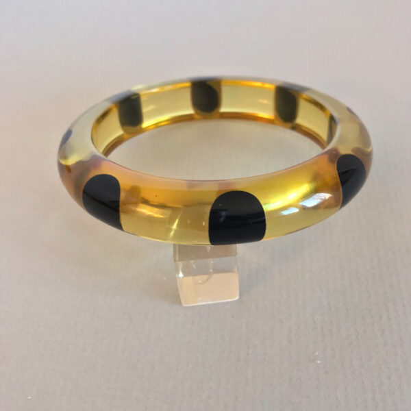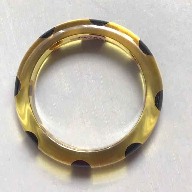 Description SHULTZ bakelite bangle in apple juice with 8 black dots around it, 2-1/2" by 1/2" with 1/3" walls. The last two pictures show this bangle with other which may be available on this web site separately. It is so versatile and can be worn with lots of other bangles, some of which my be for sale on this site.