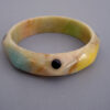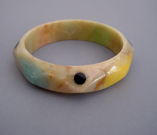 SHULTZ bakelite bangle in swamp green with caramel brown marbling with long oval colorful dotsView Product #35231 All items in excellent vintage condition unless otherwise noted.
