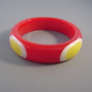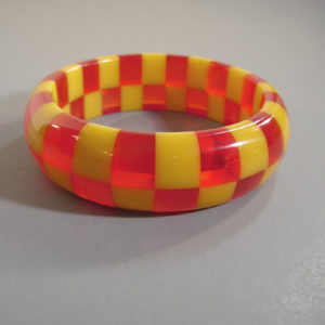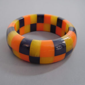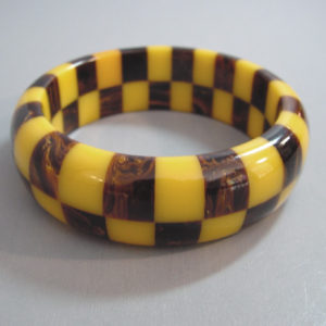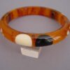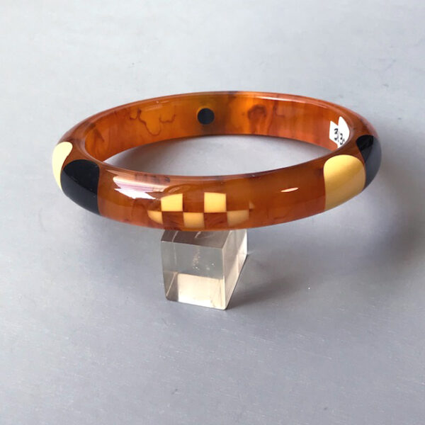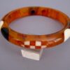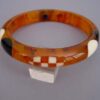 Description SHULTZ bakelite bangle, translucent marbled caramel with black and cream dots, caramel and cream checked dots, 2-1/2" by 1/2" by 1/3". This was made in 2006.