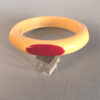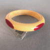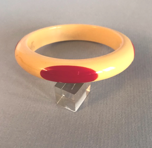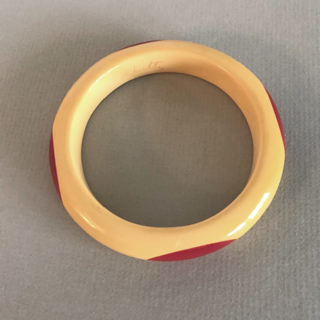 SHULTZ bakelite butter yellow bangle with four red long ovalsSigned and in excellent condition. Artisan Ron Schultz, who began making his wonderful bakelite jewelry in the 1980s, creates his pieces using only genuine vintage circa 1940s bakelite, and every piece is his own original work. It is signed, as are almost all Shultz pieces, and in excellent condition. It was made prior to 2010. View View View Product #B66780 All items in excellent vintage condition unless otherwise noted.