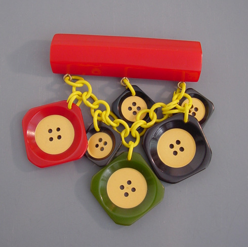 SHULTZ bakelite buttons brooch in butterscotch, red, green and black with a red bakelite bar topView Product #64240 All items in excellent vintage condition unless otherwise noted.