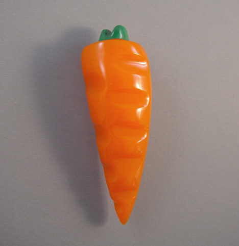 SHULTZ bakelite carved orange carrot pin with green painted topProduct #65287 All items in excellent vintage condition unless otherwise noted.