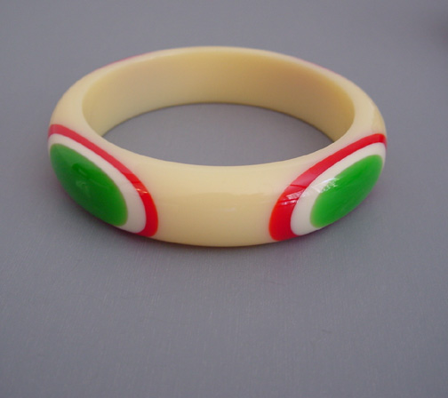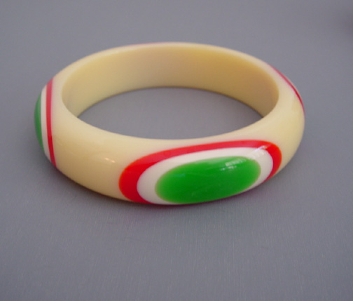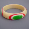 Description SHULTZ bakelite cream bangle with red, white and green bull's eye dots, 2-1/2" by 3/4" by 1/3". Artisan Ron Schultz, who began making his wonderful bakelite jewelry in the 1980s, creates his pieces using only genuine vintage circa 1940s bakelite, and every piece is his own original work. This was made prior to 2010. It is signed, as are almost all Shultz pieces, and in excellent condition.