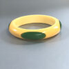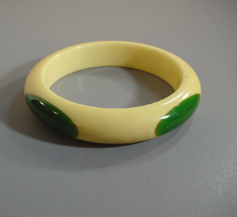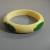Description SHULTZ bakelite cream corn bangle with four oval green dots, 2-5/8" by 5/8" by 1/3". Artisan Ron Schultz, who began making his wonderful bakelite jewelry in the 1980s, creates his pieces using only genuine vintage circa 1940s bakelite, and every piece is his own original work. It is signed, as are almost all Shultz pieces, and in excellent condition. It was made prior to 2010.