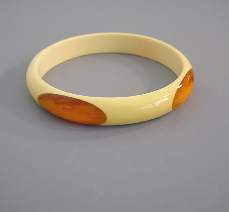 SHULTZ bakelite cream spacer bangle with caramel Bell Kogan long oval dots