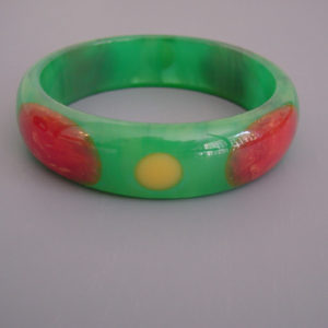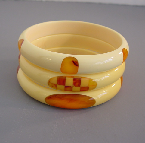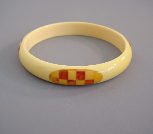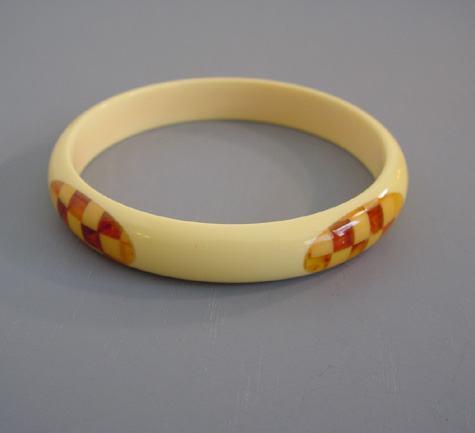 SHULTZ bakelite cream spacer bangle with caramel checkerboard dots, 2-1/2" by 1/2" by 1/4". The last photo shows this bangle with others, just to give you ideas! ViewView
