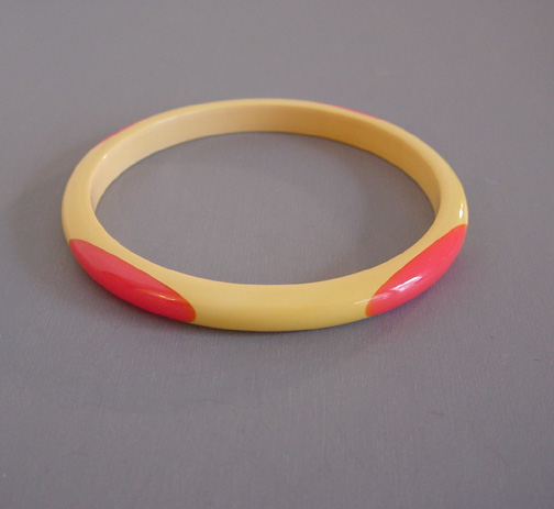 SHULTZ bakelite cream spacer bangle with pink marbled dotsProduct #35292 All items in excellent vintage condition unless otherwise noted.