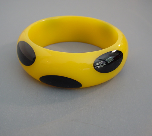 SHULTZ bakelite sunny lemon yellow bangle with 8 black oval dotsProduct #B64480 All items in excellent vintage condition unless otherwise noted.