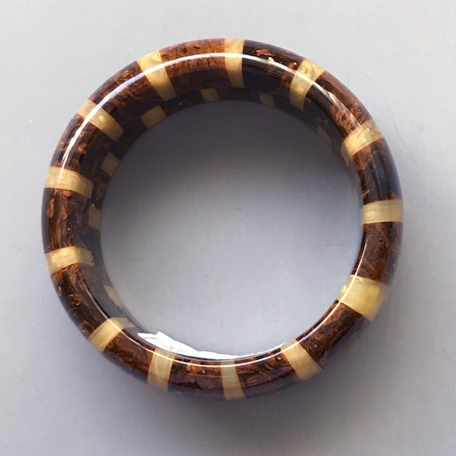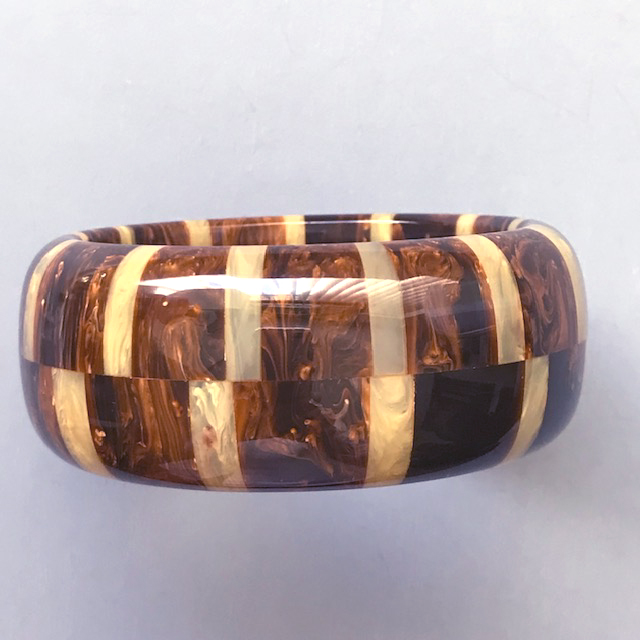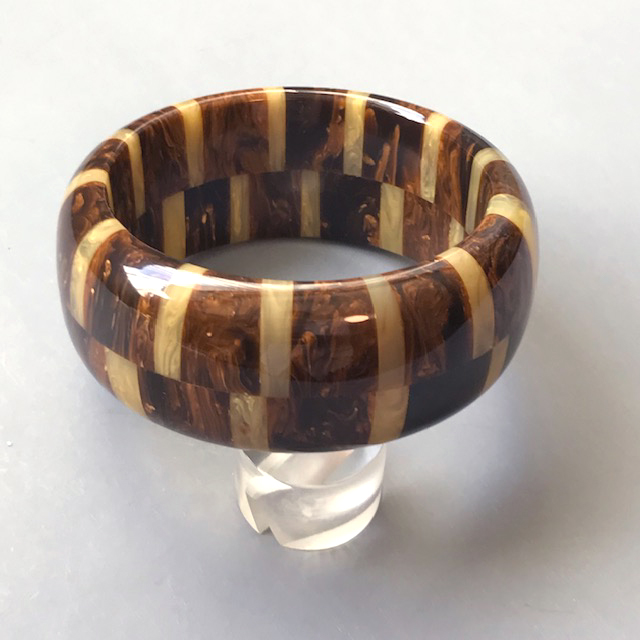 SHULTZ bakelite marbled dark chocolate brown and washed denim blue two row checked bangleProduct #35256 All items in excellent vintage condition unless otherwise noted.