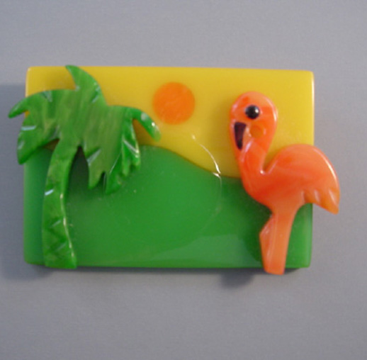 SHULTZ bakelite Moon over Miami brooch with sunrise orange flamingo, green palm tree, yellow sky and orange moonProduct #66068 All items in excellent vintage condition unless otherwise noted.
