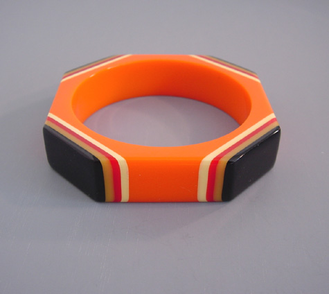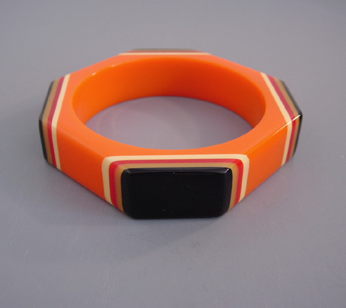Description SHULTZ bakelite orange octagonal bangle with laminated corners in black, cream, red and butterscotch, very unusual design and colors in this older bracelet made prior to 2010, 2-1/2" by 5/8" by 1/2". View Product #63857