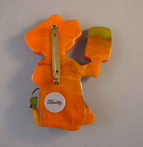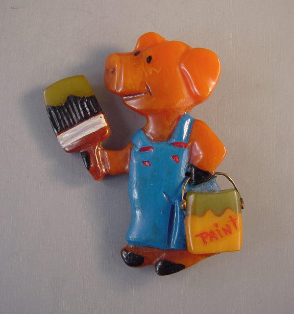SHULTZ bakelite pig painter brooch with laminated brush tip and bucket and painted pants and featuresView Product #37071 All items in excellent vintage condition unless otherwise noted.