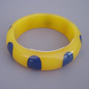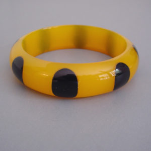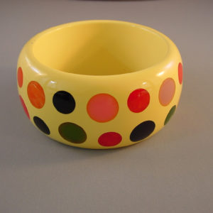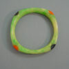 SHULTZ bakelite round cornered square bangle in marbled green with orange, cream and black and dots, made prior to 2010, it is 2-1/2" by 1/3" by 1/3". View