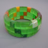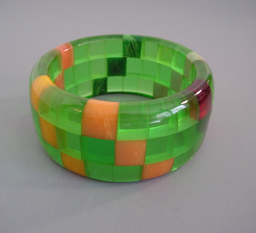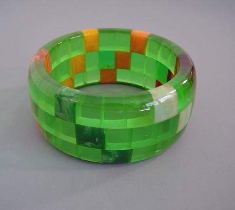 Description SHULTZ bakelite three row bangle in transparent green with semi-transparent flambe red, peach, green, translucent rose, blue and yellow swirl, 2-1/2" by 1-1/3" by 1/3".  I sure enjoy the combination of transparent and opaque checks! Artisan Ron Schultz, who began making his wonderful bakelite jewelry in the 1980s, creates his pieces using only genuine vintage circa 1940s bakelite, and this bangle was made prior to 2010.