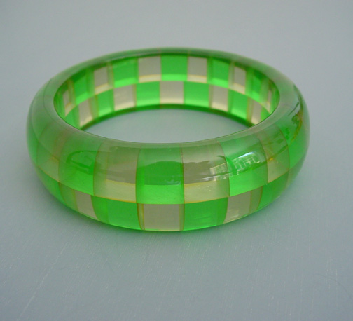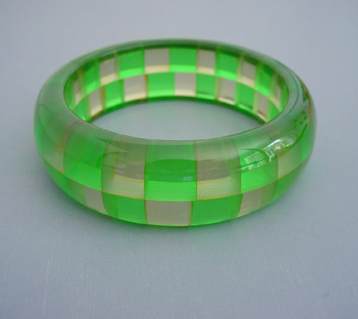 Description SHULTZ bakelite transparent green and clear two row checked bangle, 2-1/2" by 1" by 1/3". The transparent colors have always been favorites of mine, whether in vintage or artisan bangles, and they are getting more difficult to find now. It is so interesting to see the way they catch the light. This one was made prior to 2010. Product #62919