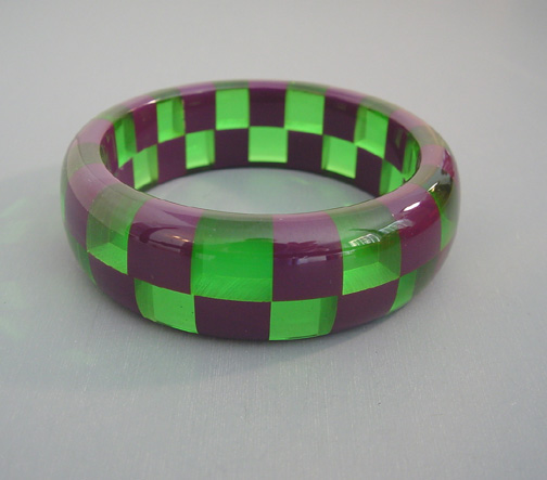 SHULTZ bakelite two row check bangle in purple and transparent greenProduct #64463 All items in excellent vintage condition unless otherwise noted.