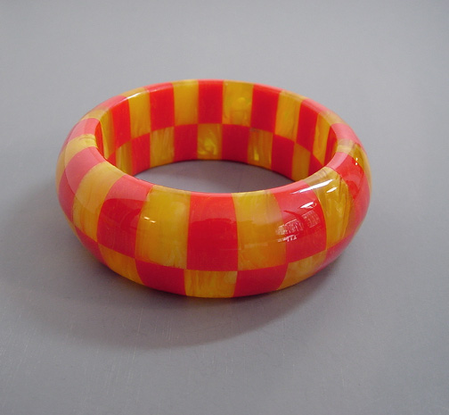 DescriptionSHULTZ bakelite two row check marbled yellow and opaque red chunky bangle, 2-1/2" by 1" with thick 1/2" walls. Ron Schultz creates his jewelry using 1940s vintage bakelite, and this was made prior to 2010. When held to the light, there are lovely streaks of apple juice in the yellow cubes.